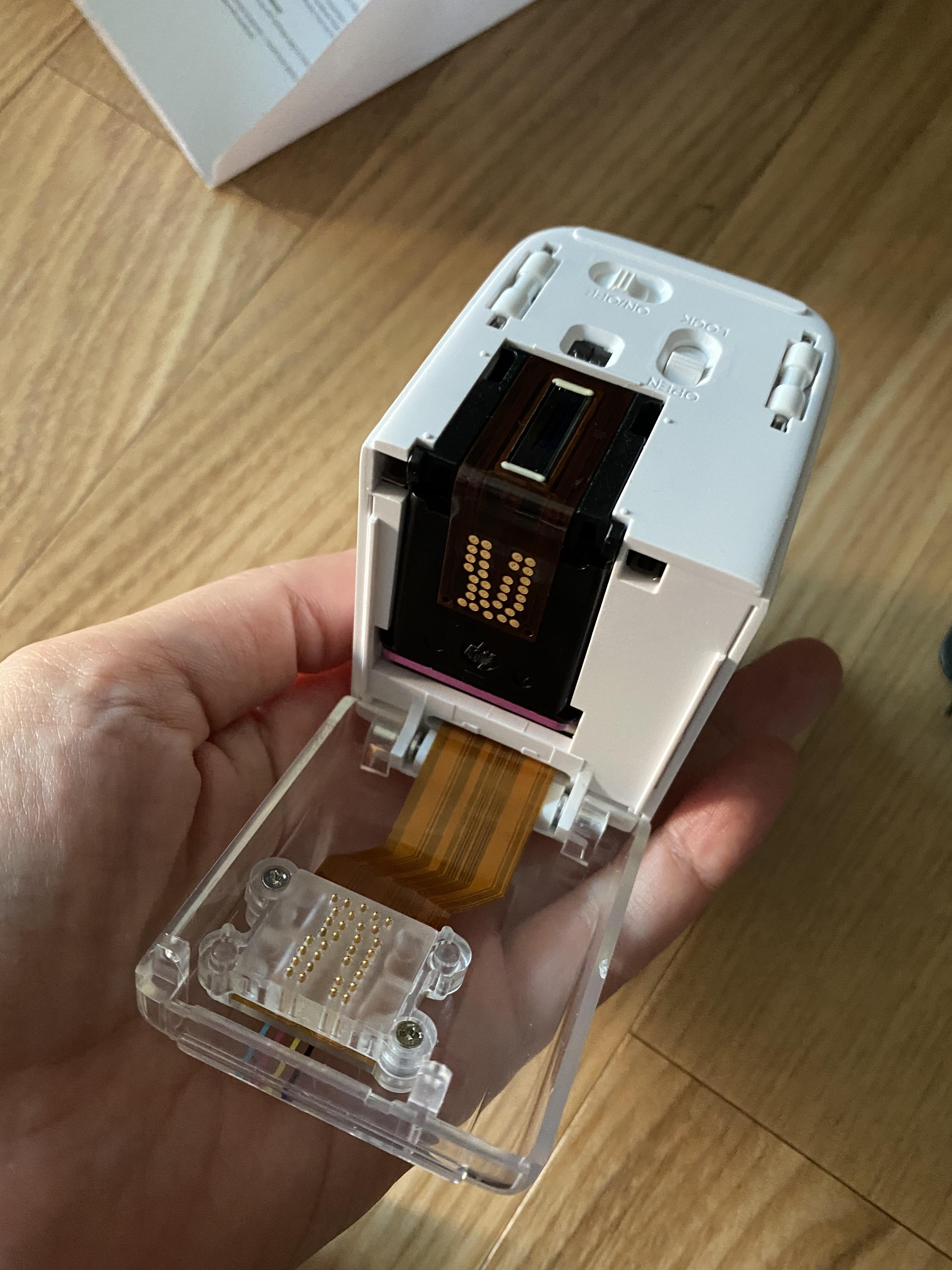 자석으로 된 뚜껑을 열고 lock버튼을 open한 후 카트리지를 넣습니다. 처음에 이게 안 들어가서 동영상 찾아보며 아주 삽질을 했지요. ㅎ;;; 카트리지는 hp제품인데 별도로 구매도 가능하다고 하더라구요. 다 쓰면 어쩌나 걱정했는데 다행입니다.